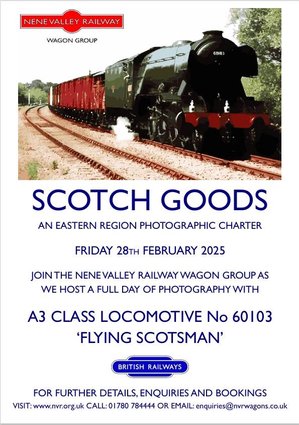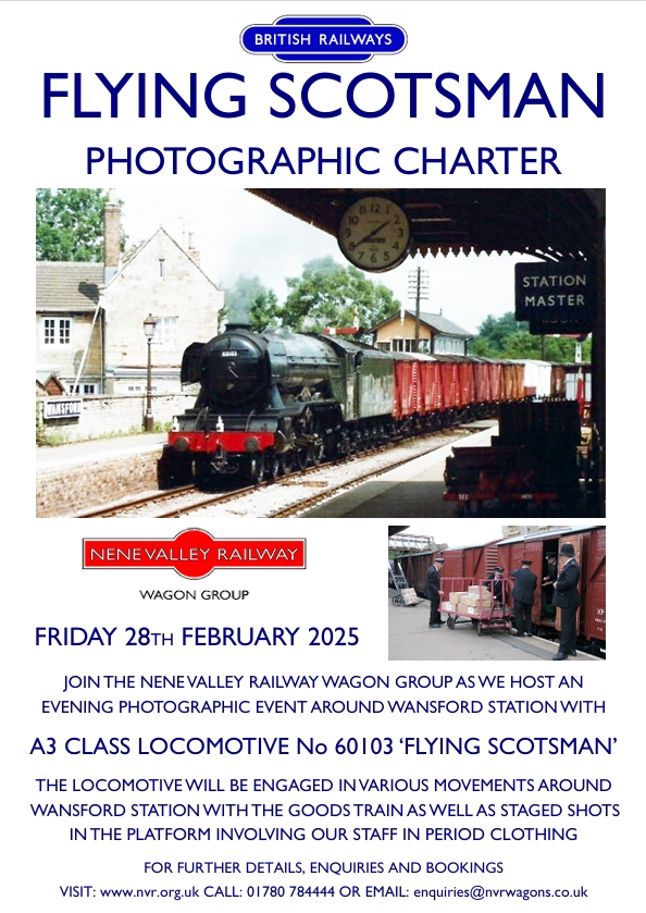 Friday 28th February sees the famous LNER A3 Class locomotive 60103 ‘Flying Scotsman’ hauling freight for the first time in over 30 years on the ‘Scotch Goods’ photo charter. This will be split in to two events – daytime and evening photo charters. The daytime charter will be across the full length of the NVR line and the evening charter will be based around Wansford Station with run throughs and static shots.